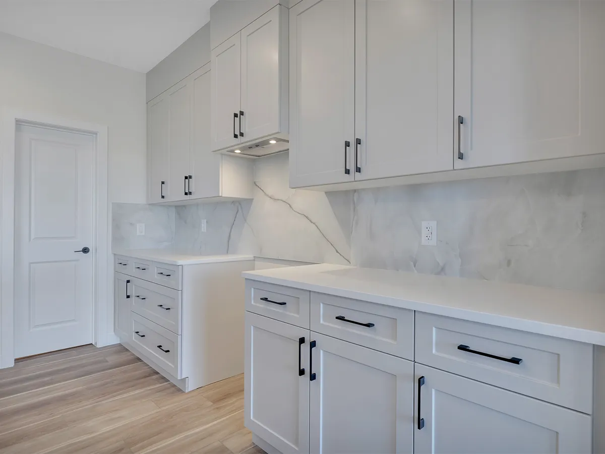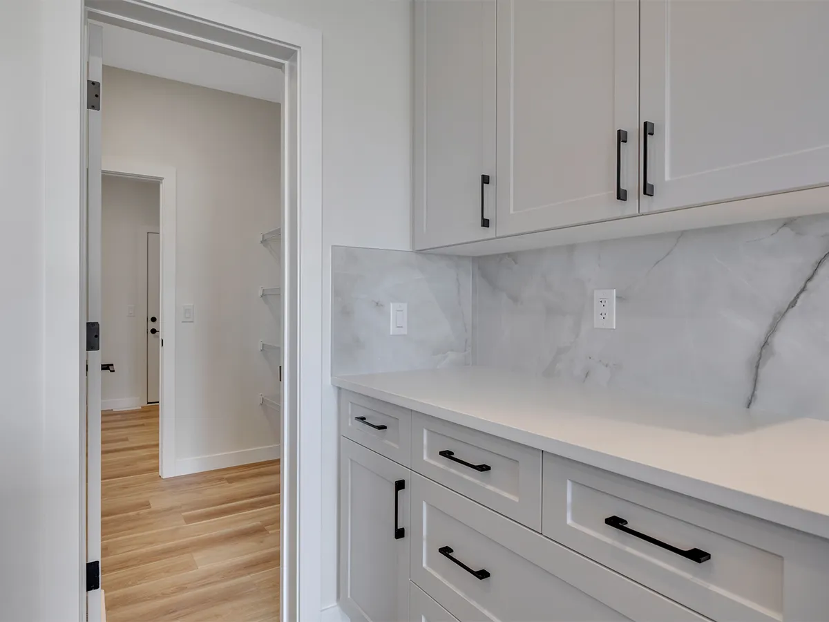 The main floor blends grand design with day-to-day practicality. The open-concept layout features a beautifully connected kitchen, dining area, and great room, all lit by the dramatic two-storey ceiling above. A large kitchen island, walk-in pantry, hood fan above the stove, and full quartz countertops throughout provide style and function in equal measure. The addition of a main floor bedroom and full bathroom makes this home ideal for extended family, guests, or a private work-from-home suite. And with a fire-rated side entrance, future basement development or a legal suite becomes even more attainable.