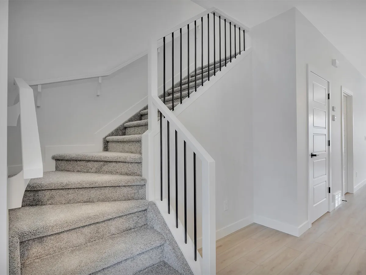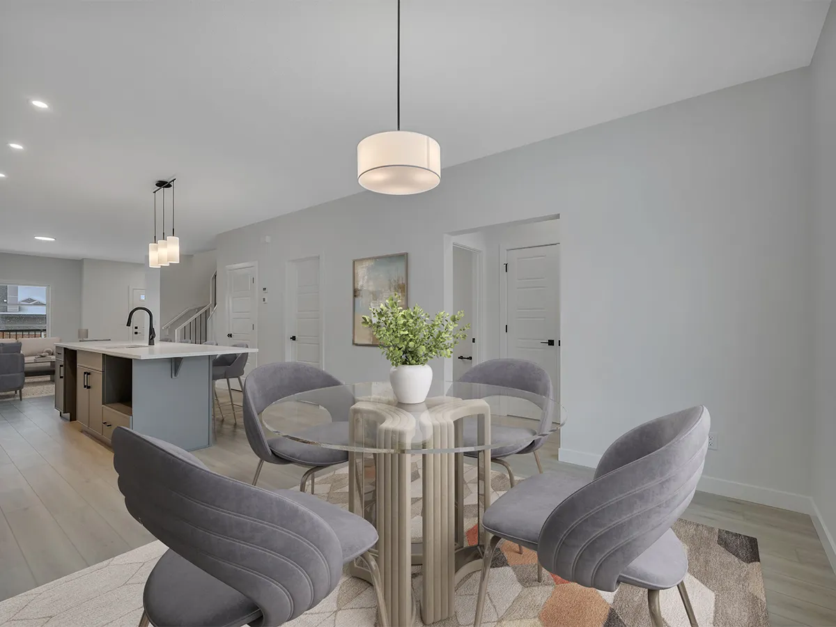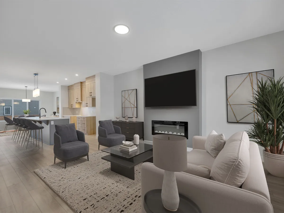 The main floor features a bright, open-concept layout where the kitchen, dining area, and great room flow together for easy entertaining and connected family life. A large island with flush eating ledge, quartz countertops, hood fan above the stove, and walk-in pantry give the kitchen both style and functionality. The side entrance adds privacy and flexibility, making it a great option for future basement development.